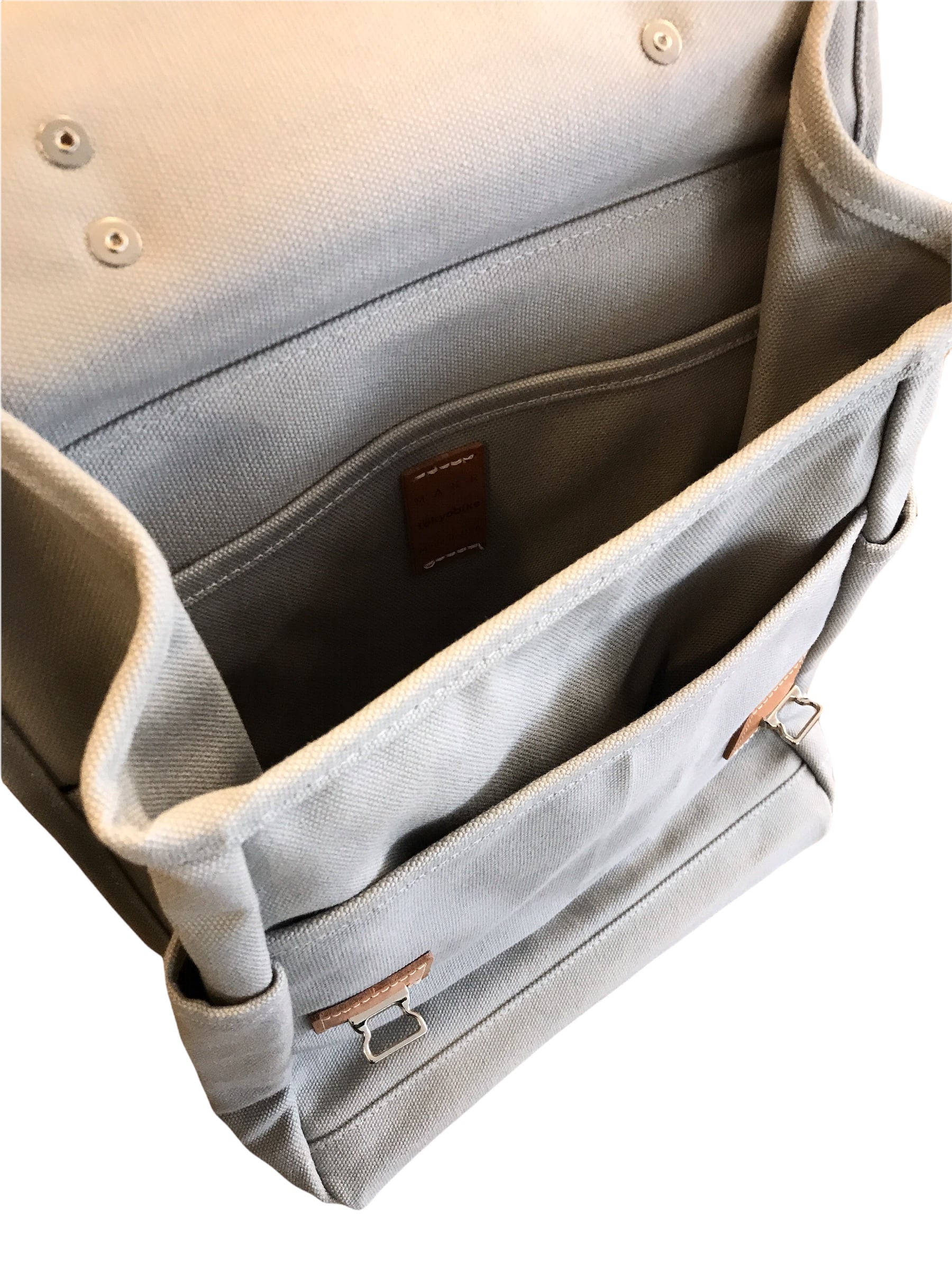 Die vielseitige Tasche kann sowohl am Fahrrad als auch am Körper getragen werden. Drei Knöpfe aus Leder und Metall lassen sich schließen, um die Tasche am Fahrrad zu befestigen. Zwischen den Fahrten kann der abnehmbare Schultergurt umgehängt werden, sodass die Tasche problemlos mitgenommen werden kann, wo ihr Besitzer hingeht.